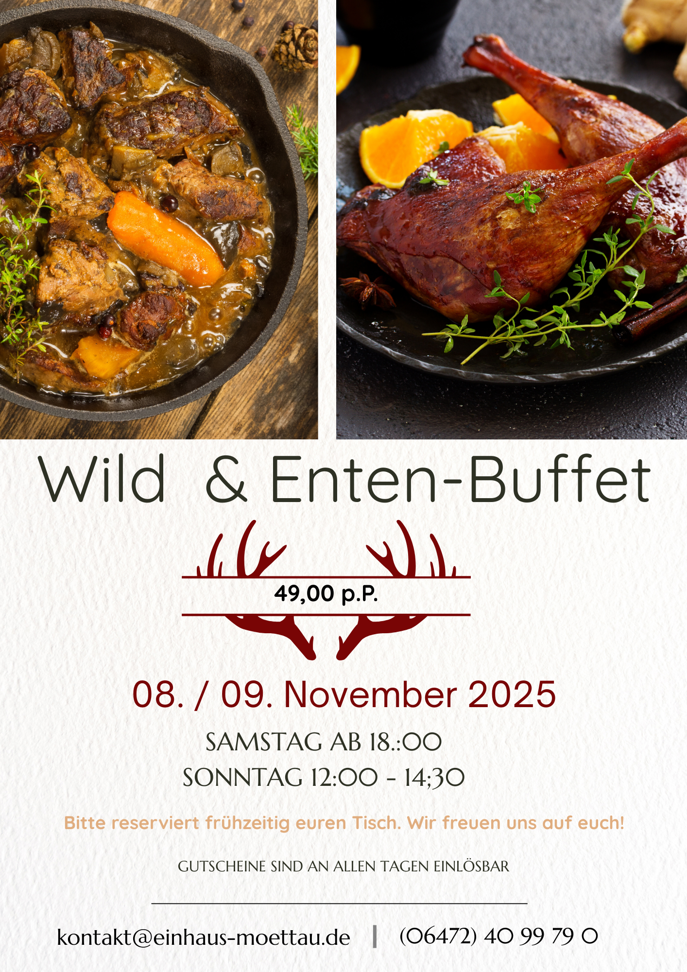 Liebe Gänsefans, die Preise für Gänse sind in diesem Jahr unangemessen in die Höhe geschnellt. Die enorme Preissteigerung zwischen 75% und 100% können wir nicht auffangen und müssten unseriöse Preise für unser beliebtes Gänse-Enten-Buffet aufrufen. Daher haben wir uns entschieden, den Irrsinn auf dem Gänsemarkt nicht mitzumachen und dieses Jahr keine Gans anzubieten. Statt einem Gänse-Enten-Buffet wird es ein Wild & Enten-Buffet geben. So können wir den Preis fürs Buffet stabil halten und euch gleichzeitig trotzdem etwas Besonderes anbieten.Button